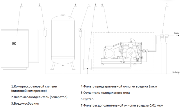 Ниже приведена схема компрессорной системы, которая позволит максимально гибко получить давление на выходе от 16 до 40 бар (изб.).